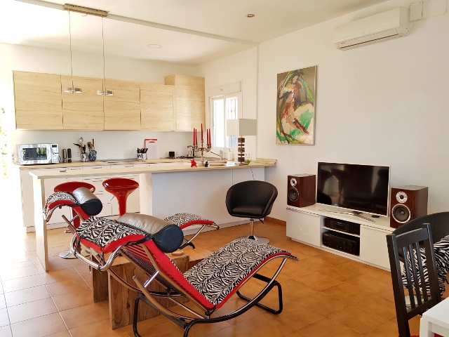 Der Zugang zur Villa erfolgt ueber eine Veranda mit einer gemuetlichen Sitzecke, direkt in den großen offenen Wohn-Essbereich mit integrierter moderner Einbaukueche und Fruehstuecksbar. Von der Kueche hat man einen direkten Zugang zur Grillterrasse.